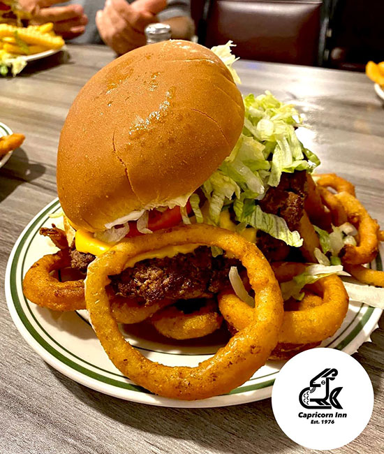 Welcome to Capricorn Inn, where the heart of Wilmington, OH meets the soul of traditional American cuisine. Our menu boasts an array of mouthwatering delights, from classic Club Sandwiches stacked high with premium ham, turkey, bacon, Swiss, and provolone, to the indulgent Double Rod Burger – a pound of perfection with lettuce, tomato, pickle, tangy mayo, and cheese. And don't forget to satisfy your sweet tooth with our delectable Funnel Fries. Join us for a culinary journey that blends comfort and flavor, creating an experience as unforgettable as our charming town. Order Carryout or Delivery today!